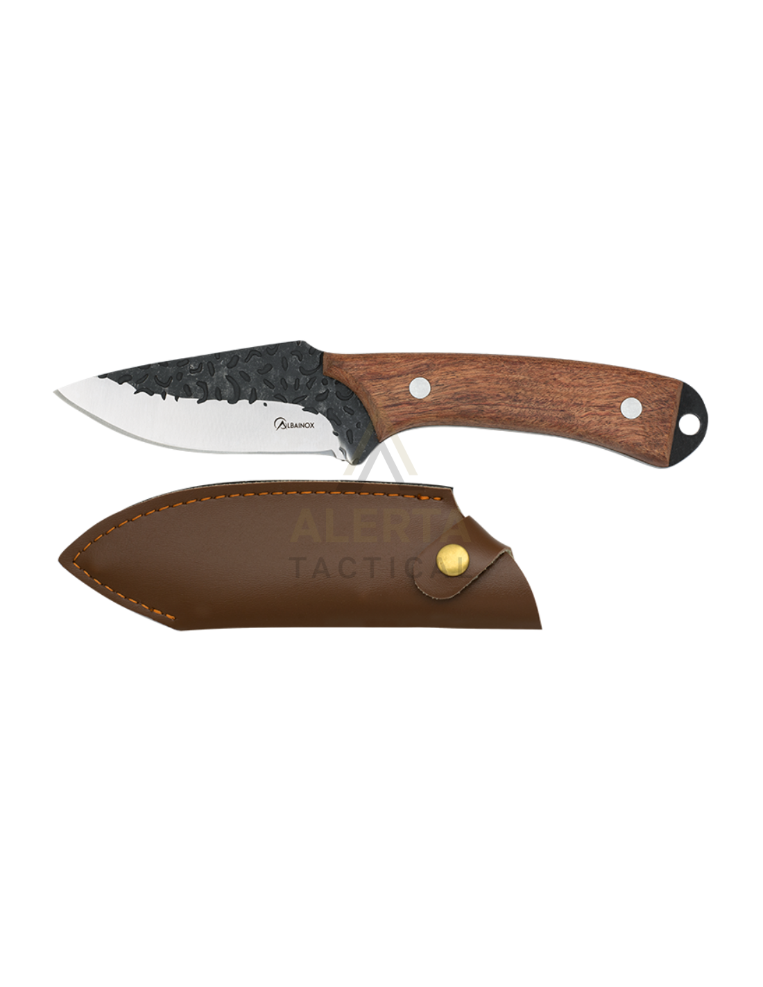 El cuchillo de caza de ALBAINOX ofrece resistencia, diseño robusto y funcionalidad. Su hoja de acero 3Cr13Mov con acabado negro garantiza durabilidad y buen rendimiento. El mango de madera natural y su construcción enteriza aportan firmeza, siendo ideal para actividades al aire libre o uso controlado.