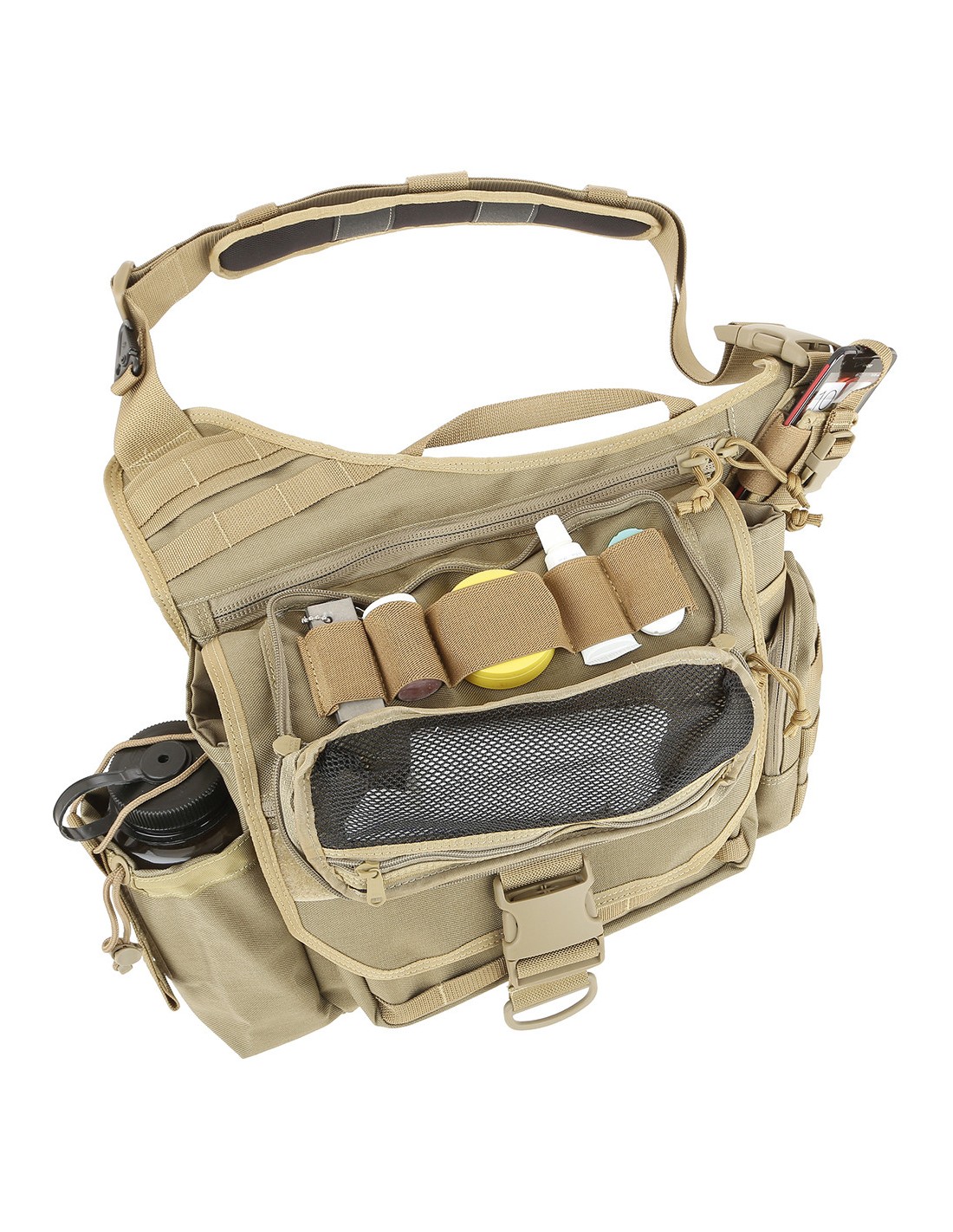 - Bolsillo Lateral A: 15 cm x 9 cm x 3 cm con bolsillo interno, 6 puntos de fijación PALS, y bolsillo adicional detrás.